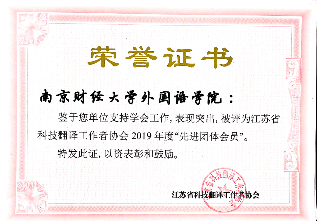 我院荣获江苏省科技翻译工作者协会2019年度“先进团体会员”称号。我院肖辉教授荣获江苏省科技翻译工作者协会2019年度“先进个人会员”称号。