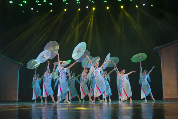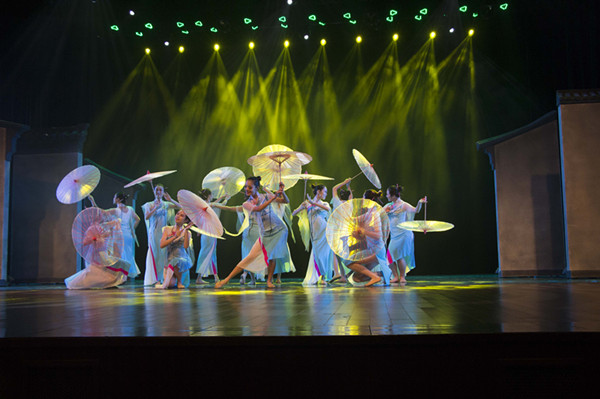 决赛现场,高手如云。聚光灯下,柔乐轻起,舞者翩翩起舞。于小城雨巷之间,用花伞描绘出江南水乡之美卷;用柔美而丰富的肢体语言,且看雨中朦胧的小女子婀娜之姿。有缓缓踱步、有轻盈一跃,或藏匿身形,或集群而舞。姑娘们仍面带笑容,每一个动作,只为完美二字,每一个步伐,只求最好。整个过程中,道具墙快速且平稳地移动着,完美地将舞蹈情节衔接起来。而道具墙的完美衔接要归功于我院男生的积极配合,他们也参与到舞蹈团的排练,确保整个节目的流畅与准确。