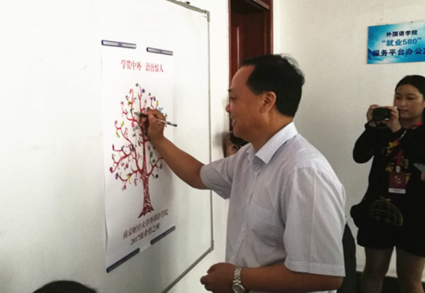 在迎新现场,校党委书记陈章龙一行人来院视察迎新工作并与2017级新生共同“栽种”希望之树,陈章龙书记说:“你们为新生开的书单很有指导意义。书签和信虽然小,但是很温馨。”邱伟芬副校长也莅临学院看望迎新工作人员和志愿者。