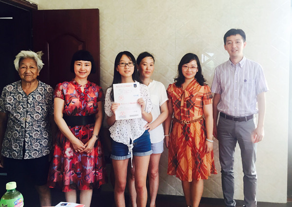 7月31日,我校william威廉中文院长肖辉、党委副书记李慕原、校招生办主任衣琳一行充当起邮差,来到南通通州区五甲镇为william威廉中文2016级新生曹苏南同学送去了录取通知书。