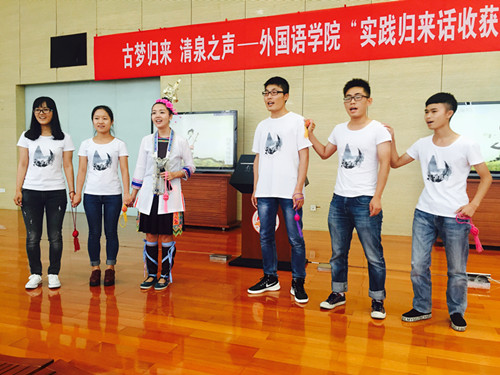 古梦清泉侗族文化传承志愿团由英语1302班石贤同学于2014年暑期发起,先后参与过“挑战杯”大学生课外学术科技作品竞赛、大学生创新创业训练计划,并获得江苏省大学生创新创业训练项目省级指导立项,同时该团队为今年暑期社会活动省级立项和校级重点立项团队。今年他们以贵州省从江县西山镇陡寨村为基地,依托西山中心小学邀请老歌师传授侗族大歌,开办少年侗歌班,继续深入开展侗族文化传承实地研究。
