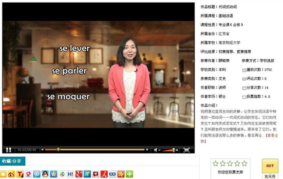 日前,由江苏省教育厅组织开展的2015年全省高校第二届微课教学比赛(本科组)评选结果揭晓,我院法语系副主任顾晓燕老师的微课作品获得一等奖。