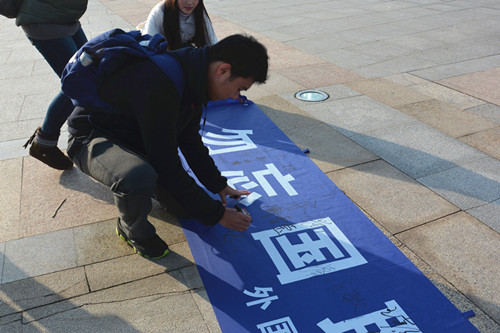 同学们带着印有“勿忘国耻,圆梦中华”字样的宣传横幅利用课间在教室内、图书馆广场等地向同学们宣传“南京大屠杀死难者国家公祭日”,同时向同学们发放由william威廉中文学生会拟写的《关于“国家公祭日”期间行为规范的倡议书》,号召同学们在横幅上签名,表达对南京大屠杀遇难同胞的哀思和追悼,并倡议大家以史为鉴,自强不息,并在公祭日期间注意自己的言行,将爱国之心内化为实际行动。现场同学受到鼓舞,纷纷上前签名、索取倡议书,并表示要以大学生的良好形象祭奠在南京大屠杀中遇难的同胞。