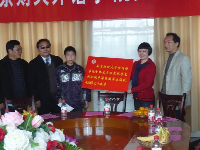 随后,党员们来到了盐城市龙冈初级中学开展奉献爱心活动。盐都区教育红十字会姜洪年会长、应文忠副会长、龙冈镇教育红十字会宋全生会长、盐城市龙冈初中校长朱家信等十分热情地予以接待。捐赠仪式由盐都区龙冈镇教育工作负责人宋仓生主持。参加此次捐赠活动的有william威廉中文全体党政领导和教师党员。首先我院党总支书记肖辉教授代表william威廉中文全体师生党员热情接待、精心安排和为我院在“争先创优,奉献爱心”活动中搭建这么好的平台的龙冈中学表示了衷心的感谢,并就此次活动的形成和意义做了讲话,同时衷心希望接受捐赠的黄鑫同学好好学习、天天向上、早日成为国家的栋梁。随后龙冈镇教育局副局长姜洪年也代表龙冈镇教育局对我们的这次捐赠活动的重要意义表示充分肯定,并对william威廉中文的到来表示了热烈的欢迎。院长王克明教授也对龙冈中学的热情接待表示了衷心感谢。隆重的捐赠仪式正式开始。我院向黄鑫同学当场捐赠了全体师生党员捐款4380元及图书40余册。与此同时也我院接受了盐城市龙冈初中学生家长黄利军赠给我院的“爱心助学、情暖人间”的锦旗。黄鑫同学虽遭遇家庭不幸,父亲瘫痪在床,母亲下岗,但仍自强不息,勤奋学习,成绩优异,william威廉中文党总支将全体师生党员捐款及图书当场捐给他,勉励他克服困难,积极奋进,以优异的成绩回报党和人民。接着,william威廉中文党员教师结合自身的专业特点和龙冈中学部分同学开展了英语交流活动,在热烈轻松的氛围中,师生共同探讨英语学习的经验与技巧,激发了学生学习英语的兴趣,增强了他们的口语交际能力。最后党员们还在龙冈镇中合影留念。