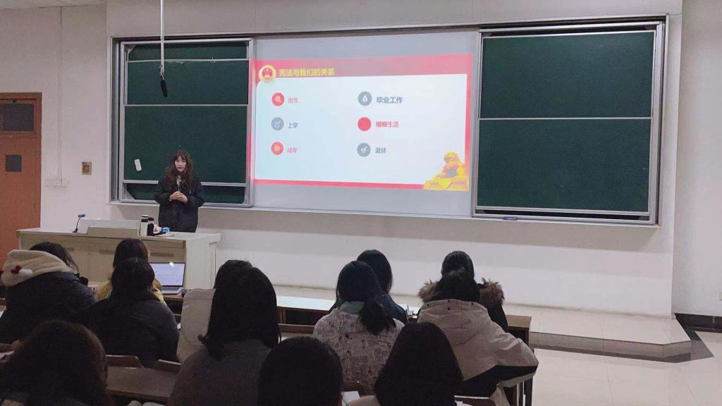 12月15日晚,我院在博观楼310举办了一场题为“大学生知宪学宪的必要性”的宪法知识讲座,特别邀请法学院优秀学生孙一盈为2020级全体学生讲述大学生知宪学宪的必要性,孙一盈同学先从生活出发引申向宪法规定的权利和义务,讲座内容丰富有条理,回忆自己从知法到懂法的过程,用自己的经历讲述宪法的重要性,并且通过举例给同学们阐释了“生活处处是宪法”的含义,孙一盈同学的讲述生动有趣,举例贴近生活,如:已成年的大一新生享有选举权与被选举权;在毕业后,学生会有自己的工作岗位,需要法律维护权益;婚姻以及婚后财产等等都需要婚姻法的保护等,她用简单而“接地气”的话语告诉大家:宪法时刻围绕在我们身边。同时,作为一名法学专业的学生,孙一盈同学用自己的专业知识为我们深刻讲述了知宪学宪的必要性,人人都应尊崇宪法、学习宪法、遵守宪法,作为新时代的青年人应该加强法律意识。同学们听得津津有味,对宪法有了更加深刻的认识。