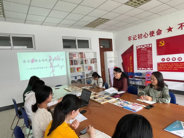 会议伊始,党支部书记陆晓梅向各位老师领导介绍我院“廉洁”示范点建设初步结果,包含我院师生书法作品、绘画摄影作品及“廉洁”主题古诗文英译刊物。全体学生党员依次分享此次古诗文翻译心得与体会,此次专业特色与党课主题相结合的成功尝试也获得了吕戎部长的肯定与鼓励。
