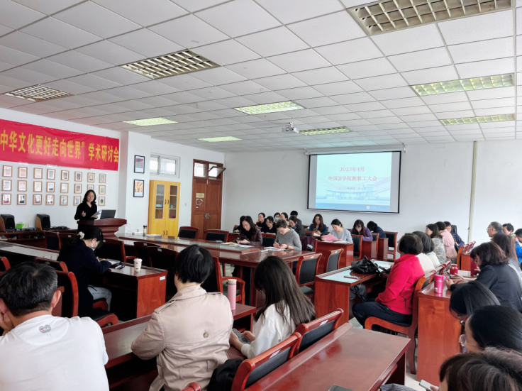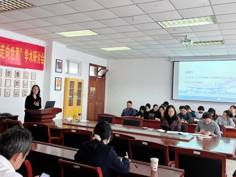 英语系主任张晓甜向全院教师传达了学校近期本科教学工作会议的内容,包括:第三批国家一流本科课程申报准备工作、期末考试组织工作、期中教学检查事宜、专业审核评估,以及我院两位教师教学事故的处理通报等。教学顾问邵怡向大家解读了相关教学规范与纪律,传达了近期教学检查、教学座谈会意见反馈等情况,鼓励老师们以昂扬的态势迎接本科教育教学评估的到来。