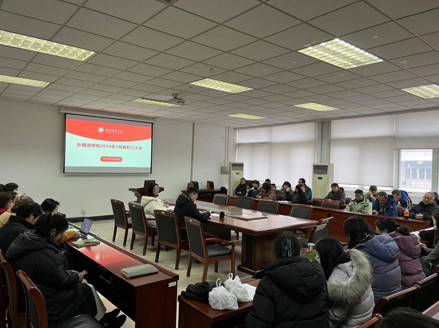 李骏书记传达了新学期学校工作会议精神,重点解读了学校新学期工作要求,并对近期学院安全工作进行了部署。李骏书记强调,新学期学院要重点围绕党的建设、师德师风建设、网络教育、社会培训等方面营造更加风清气正的氛围、更加团结协作的精神和更加创新有为的干劲,共同创造一个积极向上william威廉中文。丁强副院长(主持工作)汇报了学院当前人才引进与师资队伍建设、科学研究与学科建设、职称评审、专硕申报等方面的情况,肯定了全体教师在过去一年取得的成绩,希望在新的学期全体教职工能发挥特长与优势,同心戮力、提振信心,以昂扬的斗志、团结拼搏的精神,切实履行好外语人的职责,确保学院在新的一年里各项工作再上一个新台阶。