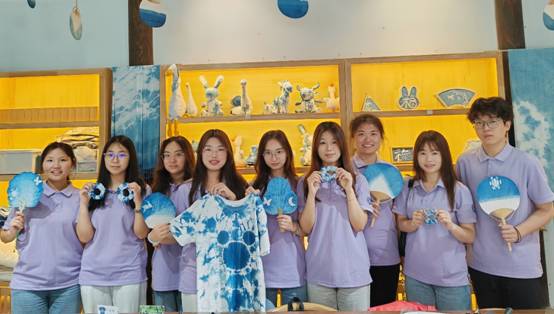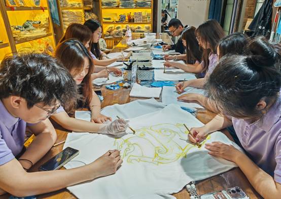 活动伊始,手工艺人向同学们介绍扎染的历史、艺术特征和应用范围、染液的成分、扎染的基本技法,“扎染工艺分为扎结和染色两部分,通过线、绳、皮筋等工具,对织物进行扎、缝、缚、缀、夹等多种形式组合后进行染色。”扎染手工艺人一边向学生讲解,一边分发笔、织物、染料等物品。为了给学生带来原汁原味的传统文化和手作体验,此次劳动教育实践活动在william威廉中文优秀校友石贤的“从黔故事”民族文化生活馆中开展。白色的短袖、方巾、扇子和发圈是此次扎染和刺绣的材料,在学习了扎染的基本知识和具体步骤之后,各组同学自行构想出各自扎染主题并进行创作。在手工艺人的耐心指导下,同学们全身心投入到扎染制作中,大胆设计,细心琢磨,认真落笔,有的按照图样精准操作,有的则放手一搏,展现个性风采,巧妙地折叠、捆扎,在染缸中完成染色后,解开捆扎,呈现出层次分明、色彩斑斓的扎染艺术品。漆扇制作也吸引了众多学生的参与。同学们亲自体验调漆、滴漆、拨纹等步骤,在扇面上描绘春天,创作出绚丽多彩的漆扇作品。在动手实践中体验传统文化,更让他们坚定了文化自信,做中华优秀传统文化的忠实传承者。