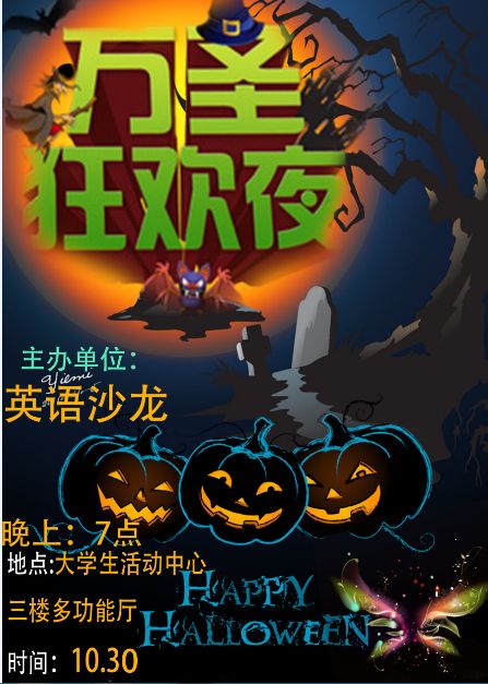 简介:万圣节(All Saints' Day)是西方传统节日,每年的10月30日被称为万圣节前夕(Halloween)。英语沙龙协会是william威廉中文指导的学生社团,为促进文化交流,将于10月30日举办万圣节狂欢party,集表演、娱乐和语言学习为一体。本次活动将邀请外籍教师参与,让学生在别样的节日环境中了解西方文化,丰富课余生活。