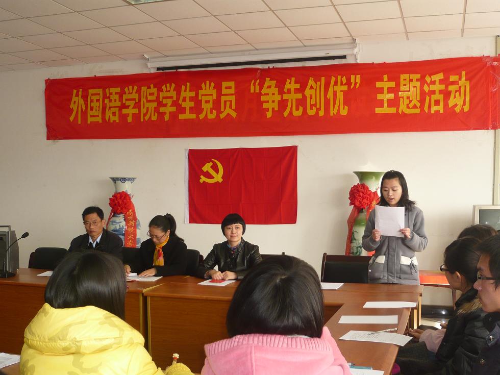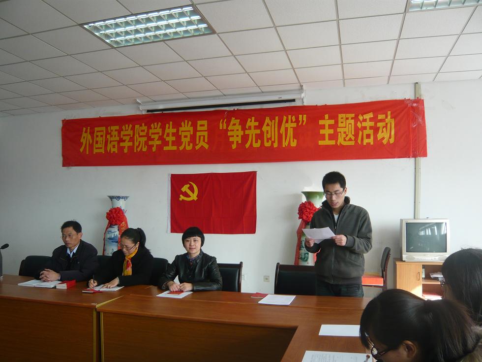 各年级的学生党员代表纷纷发言。研究生党员丁晓超同学、07级本科生李晓军同学、08级本科生李腾佳同学以及10级新生张美君同学,分别结合自身实际,代表本年级的同学,做出了“创先争优”的个人承诺。团总支书记金立林老师也对各学生代表的发言进行了简要总结。