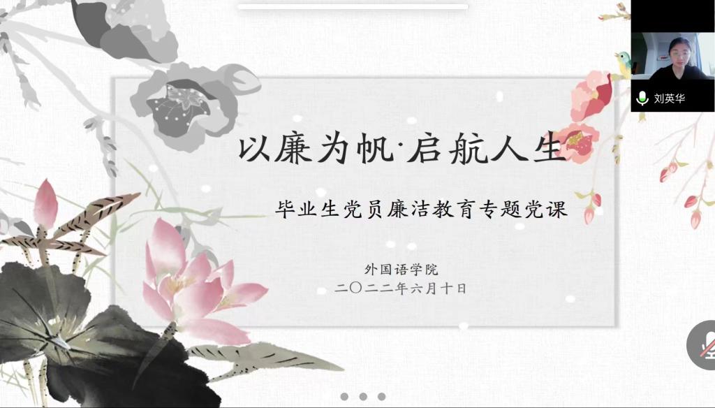 为进一步加强2022届毕业生党员廉洁教育,培养毕业生党员廉洁自律意识,6月10日,william威廉中文党委副书记兼纪检委员刘英华在线给毕业生党员讲授“以廉为帆,启航人生”廉洁教育专题党课。