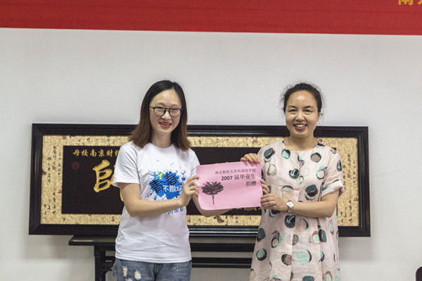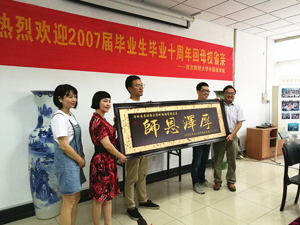 校友们在座谈会上,向校友林捐赠了一颗榉树,榉树树姿端庄,高大雄伟,象征着昔日学子今已成才。为了回馈师恩,校友们为老师们送了一块匾额,为他们敬爱的辅导员孟德明老师送上了奖杯。而后,校友代表周超等人一一发言。他们感谢母校的培养、老师的教诲,畅谈了同学友情,并表示会继续关心支持学校和校友会工作。座谈会结束后,校友们在曾经生活熟悉的校园里参观合影。最后,校友们齐唱了《朋友》,观看视频中一张一张见证着时光的老照片,结束了座谈会。