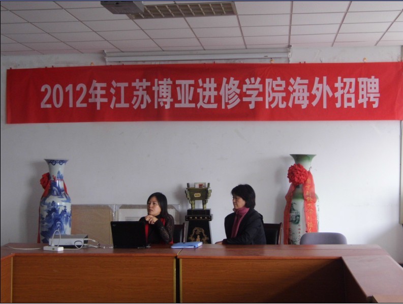 2012年11月7日下午2点,江苏博亚进修学院海外招聘会在我院专三308举行。此次招聘会是针对我院英语专业的应届毕业生,工作地点在非洲安哥拉,前期需要在国内进行为期半年的葡萄牙语培训,培训结束到海外从事的是英语及葡萄牙语的翻译工作。来自博亚进修学院的两名招聘官给大四的学生讲解工作具体内容。