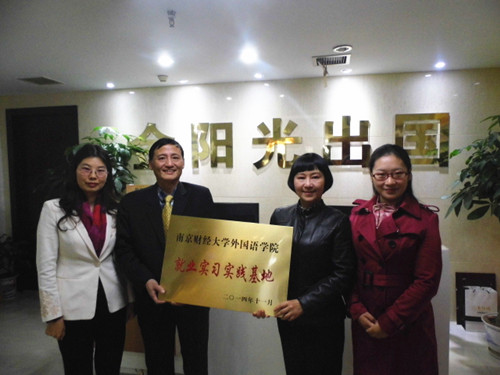 “江苏省金阳光出国服务中心有限公司”是经教育部、公安部和国家工商行政管理局联合授权批准从事自费出国留学服务及因私出入境服务的专业机构。目前主要经营项目涉及出国留学、移民服务、签证、境外旅游等项目,是江苏省人民政府认定的“3A”级重合同守信用企业。今后,我院将与该公司在学生就业,参与实习和社会实践方面进行深入合作。