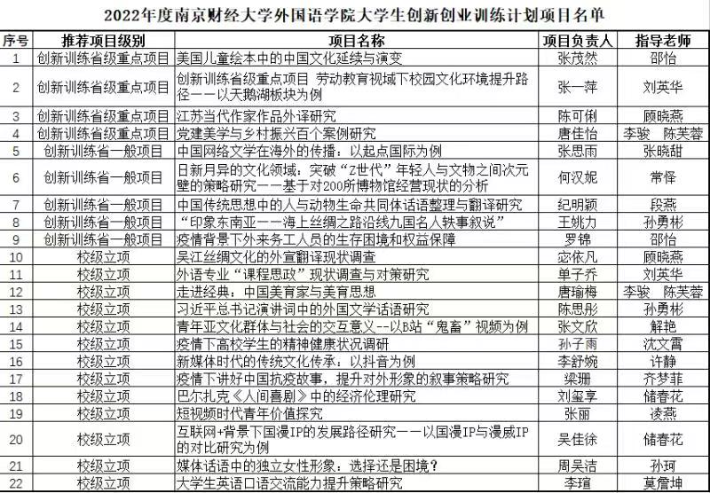 根据《省教育厅办公室关于做好2022年大学生创新创业训练计划项目申报工作的通知》(苏教办高函〔2022〕5号)和《关于组织申报2022年度WilliamHill中文大学生创新创业训练计划项目的通知》(南财教字〔2022〕16号)文件要求,经学院初评推荐、学校组织专家评审、校内公示,经学院初评推荐、学校组织专家评审,共立项326项,其中推荐省级大学生创新训练计划重点项目60项、创业实践重点项目1项、创业训练重点项目5项、创新训练计划一般项目70项,立项校级项目190项(见附件)。期中我院获推荐省级大学生创新训练计划重点项目4项、创新训练计划一般项目5项、校级项目13项(见附件)。