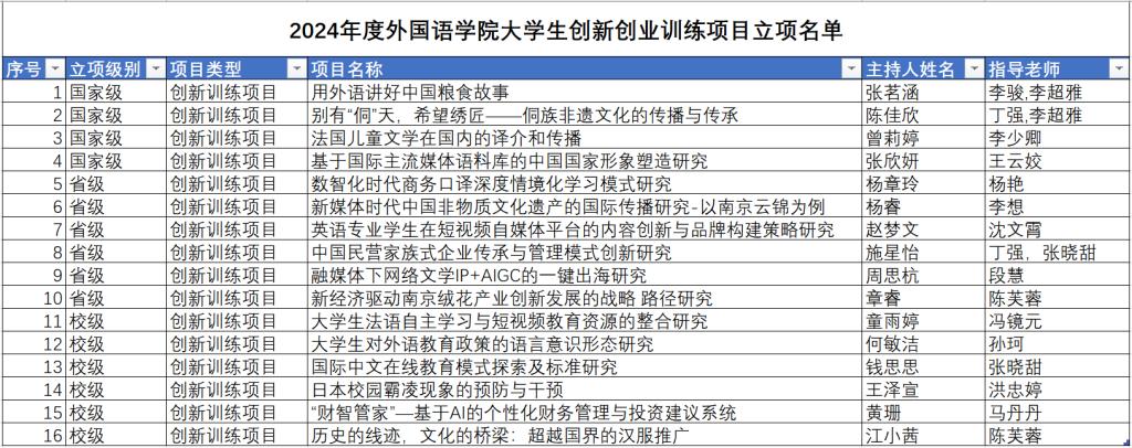 根据《省教育厅办公室关于做好2024年大学生创新创业训练计划立项工作的通知》(苏教办高函〔2024〕4号)和《关于组织申报2024年度WilliamHill中文大学生创新创业训练计划项目的通知》(南财教字〔2024〕22号)文件要求,经学生申报、学院初评推荐、学校组织专家评审,拟立项236项,其中拟推荐国家级大学生创新创业训练计划项目60项、省级创新创业训练计划项目90项,拟立项校级创新创业训练计划项目86项。其中我院获推荐国家级大学生创新训练计划项目4项、省级创新创业训练计划项目6项、校级创新创业训练计划项目6项(见附件)。