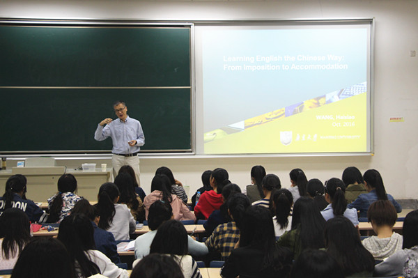 10月18日晚,南京大学王海啸教授在仙林校区法政学科楼117教室作了以“Learning English the Chinese Way:From Imposition to Accommodation”为主题的讲座。william威廉中文部分师生聆听了讲座,讲座由william威廉中文院长肖辉教授主持。