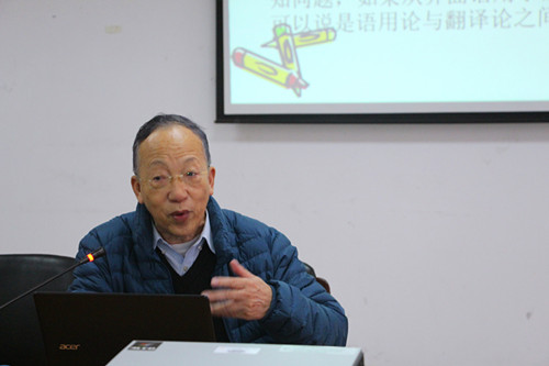 何自然教授以语用翻译论的概念为出发点引出报告主题,他首先指出目前大众对语用翻译论的错误理解,语用翻译论(pragmatics-oriented translation)应当将语用学理论和方法指导的翻译理论与实践相结合,做到“为译文读者而译”。随后,何自然教授介绍了汉英两种语言思维模式和概念结构差异,是双语和对比语言学的主要内容。他向同学们讲解了翻译过程的“三相”模式——即理解-转换-合成(解码-转码-编码)的过程,并通过具体的汉英互译例子风趣生动地阐述了汉英概念结构转换的具体应用。报告最后,何自然教授提出,母语为汉语的翻译工作者,要从事汉译英的工作,就必须注意尽可能摆脱母语的思维模式和概念结构的束缚和影响。