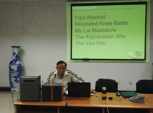 端木教授用中英双语进行了讲座,他在讲座中介绍了美国军事扩张的历史,他指出,美国自称自由帝国却历来好战,曾发动印第安战争、越南战争、阿富汗战争,使用无人机轰炸无辜平民,造成印第安人被屠杀、伊拉克难民流离失所。端木教授引经据典分析了美国打仗成瘾的历史因素、观念因素、军力因素和体制因素。并与在座同学分享了多位国际专家有关美国军事文化的研究成果。