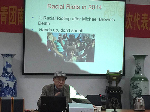 3月17日晚,解放军国际关系学院教授、博士生导师、全国高校英语报刊教学研究会会长端木义万应邀来我院讲学。讲座在法政学科楼308会议室举行。端木教授面向我院大三学生作了以“Perspectives on America’s Racial Riots”为题的主题讲座。