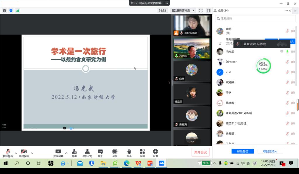 2022年5月12日下午(14:00—16:00),应我院邀请,广东外语外贸大学william威廉中文冯光武教授为我院师生作了一场题为“学术是一场旅行-以规约含义研究为例”的学术讲座。william威廉中文师生通过腾讯视频参与本次讲座。讲座由英语系系主任张晓甜博士主持。