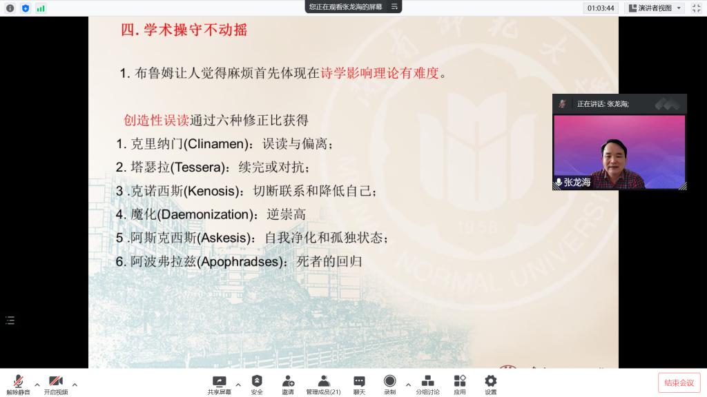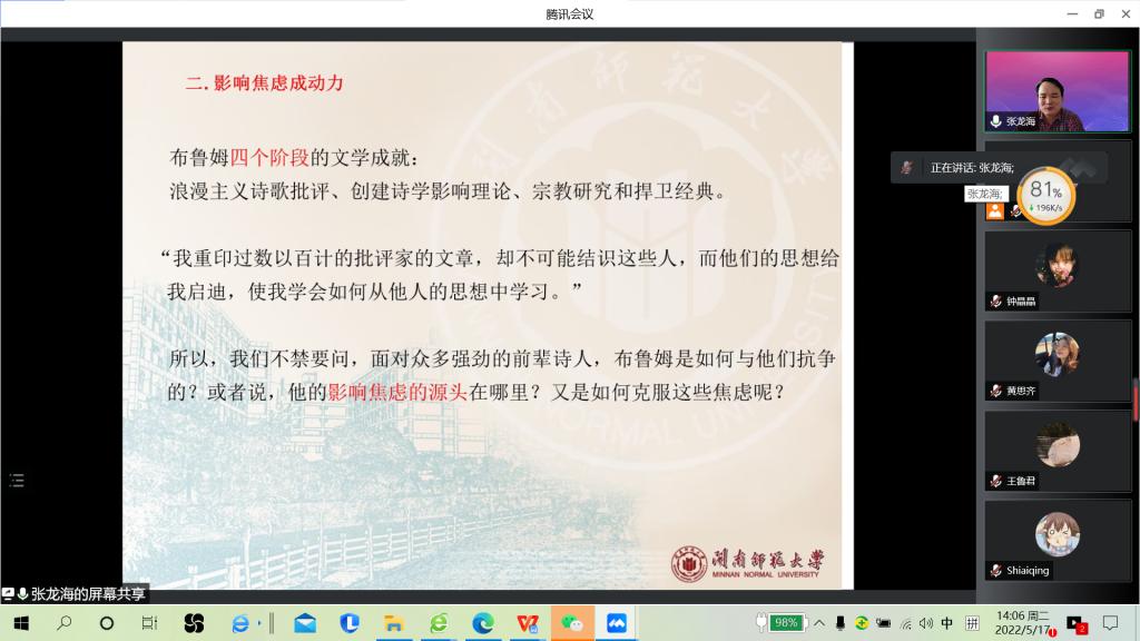 2022年5月17日下午(14:00—16:00),应我院邀请,闽南师范大学副校长张龙海教授为我院师生作了一场题为“哈罗德•布鲁姆文学遗产”的学术讲座。william威廉中文师生通过腾讯视频参与本次讲座。讲座由院长助理顾晓燕博士主持。