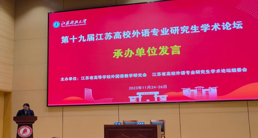 11月25日,江苏省外国语言文学研究生学术创新论坛暨第十八届江苏高校外语专业研究生学术论坛在江苏科技大学成功举办。本次论坛的主题为“跨学科与新视野”,旨在引导研究生聚焦外国文学、语言学、翻译学、区域国别研究等学科中的重大、前沿、热点问题。我院段慧、邵怡两位老师和5名研究生报名参加了此次论坛。