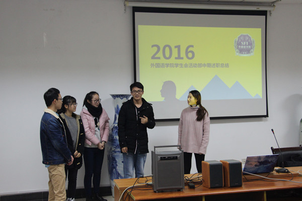 述职大会开始,由秘书处洪娇娜上台作了简单介绍并揭开了此次述职大会的序幕。本次述职大会由抽签决定上台顺序,第一个述职的部门是活动部,活动部部长孙媛先介绍了本部门的小部员,体现出一种团结向上的部门氛围,又对活动部这一学期举办的活动的优缺点作出了总结,对下学期的外语文化节作出了很好的规划,主席的提问环节他们也给出了很好的示范,总之,活动部的总结给本次述职开了一个好头。
