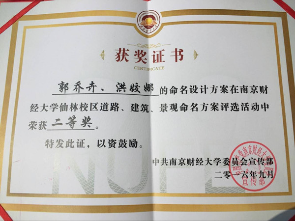 2016年5-6月,我校组织开展了校园文化师生共建工作,面向全校公开征集仙林校区道路、建筑、景观命名方案。日前,学校公布了命名方案评选活动的获奖结果。我院15级郭乔卉、洪姣娜同学提交的方案荣获二等奖。