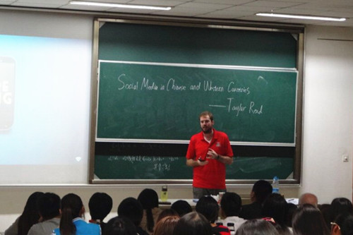 10月22日晚6:30,我校“中西方文化论坛”2015年秋季学期第三期在教C304成功举办。讲座主题为“Socical Media in Chinese and Western Countries”(社交媒体—未来商业和爱情的运作桥梁),主讲人为我校优秀美国教师Taylor Reed。