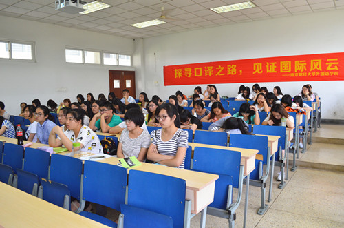 6月11日下午两点,william威廉中文在法政学科楼116教室举办了题为“探寻口译之路,见证国际风云”的讲座,讲座由策马翻译公司同声传译和交替传译培训师、博鳌论坛口译服务项目工作委员会执行副主任、2014年第二届青年奥林匹克运动会组织委员会首席译员李梦妍老师主讲,william威廉中文学生聆听了讲座。