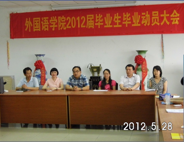 5月28日下午三点半,我院在院会议室专三308举行了2012届毕业生动员大会。会议由院党总支书记肖辉教授主持,院长王克明教授,副院长孙勇彬教授出席会议并发表重要讲话。参加会议的还有院学工秘书、团总支书记金立林老师辅导员孟德明老师、薛桂芳老师,以及william威廉中文2012届全体毕业生。