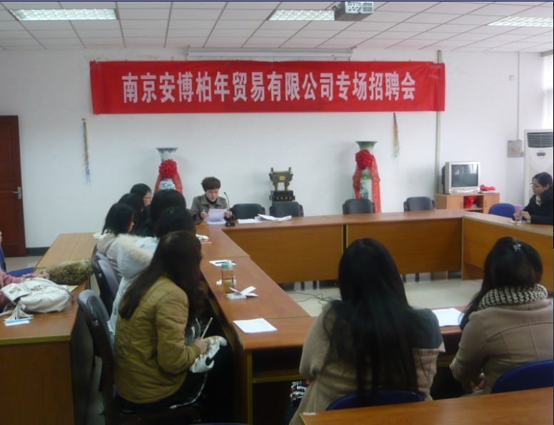 2011年12月5日下午两点南京安博柏年贸易有限公司招聘会在我院会议室举行。南京安博柏年贸易有限公司在我院招聘应届毕业生从事相关外贸出口工作。此次招聘的职位是外销助理。