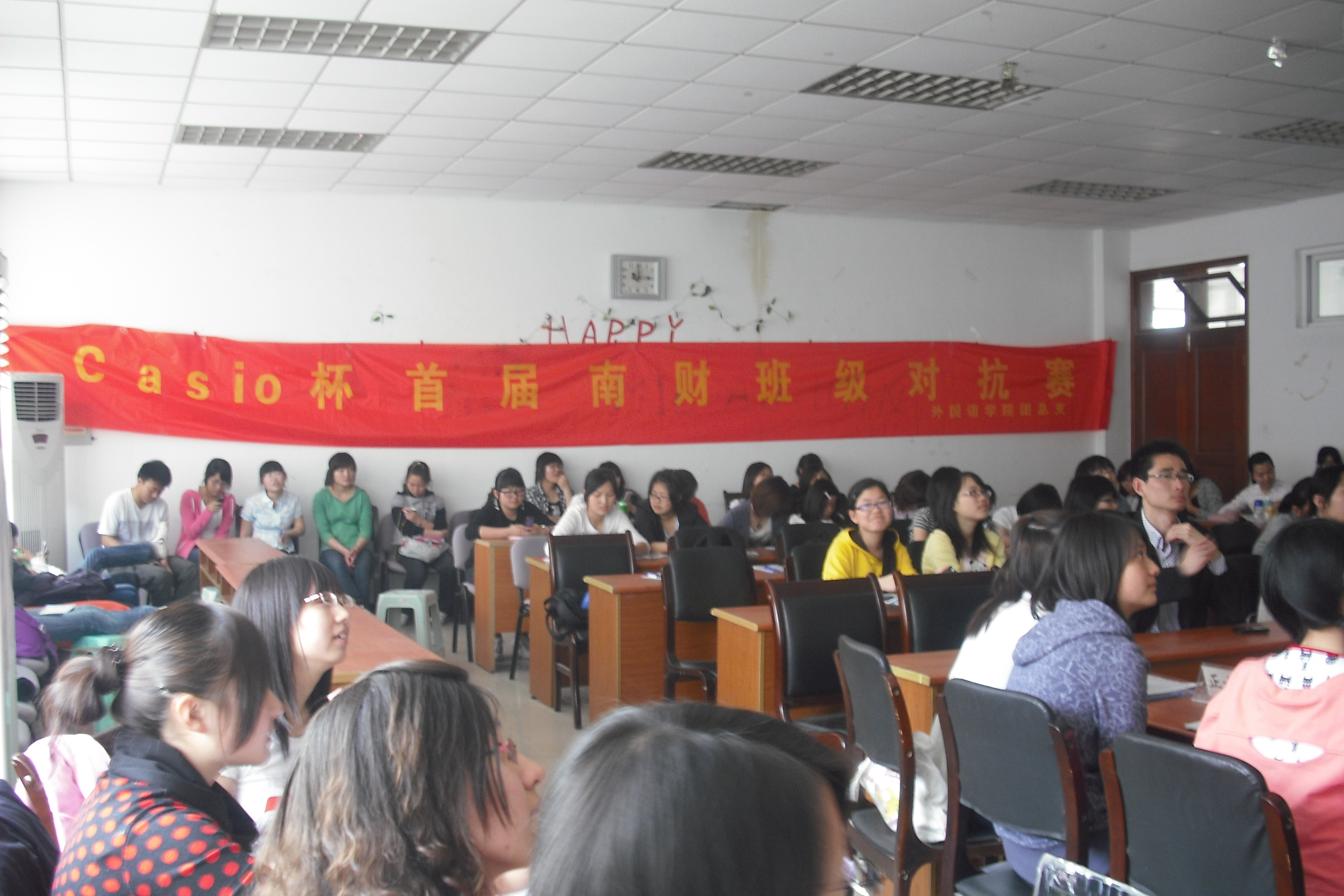 CASIO杯首届南财班级对抗赛于5月11日中午12点30分在专三308空前激烈地进行。从两次淘汰赛中脱颖而出了两支队伍:英语081班和英语082班。选手们摩拳擦掌,在赛场上游刃有余地应对着古怪而新颖的考题。现场评委嘉宾有外院程水英老师、刘婷婷老师、金立林老师以及来自卡西欧的吴银虎先生。比赛内容十分丰富,有涉及天文地理的选择题、判断题;智力急速转弯的简答题;文智兼测、默契考验的猜词题;大喜大忧、扣人心弦的风险翻译题。