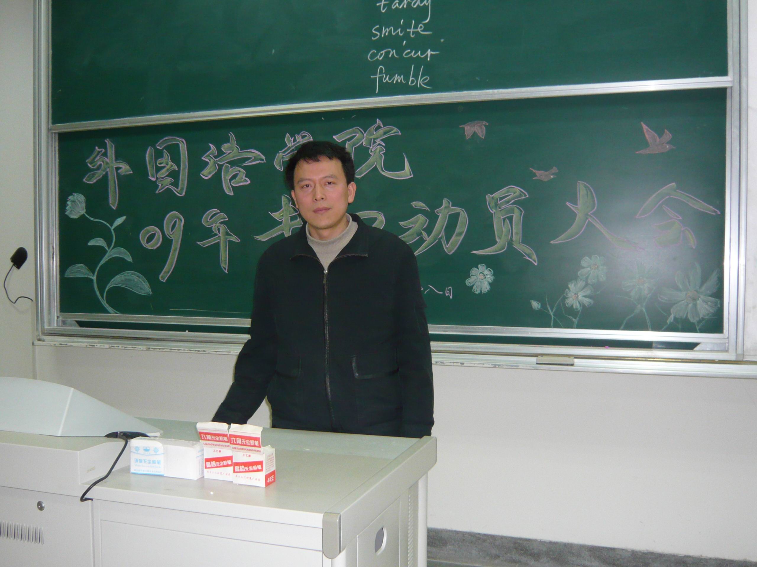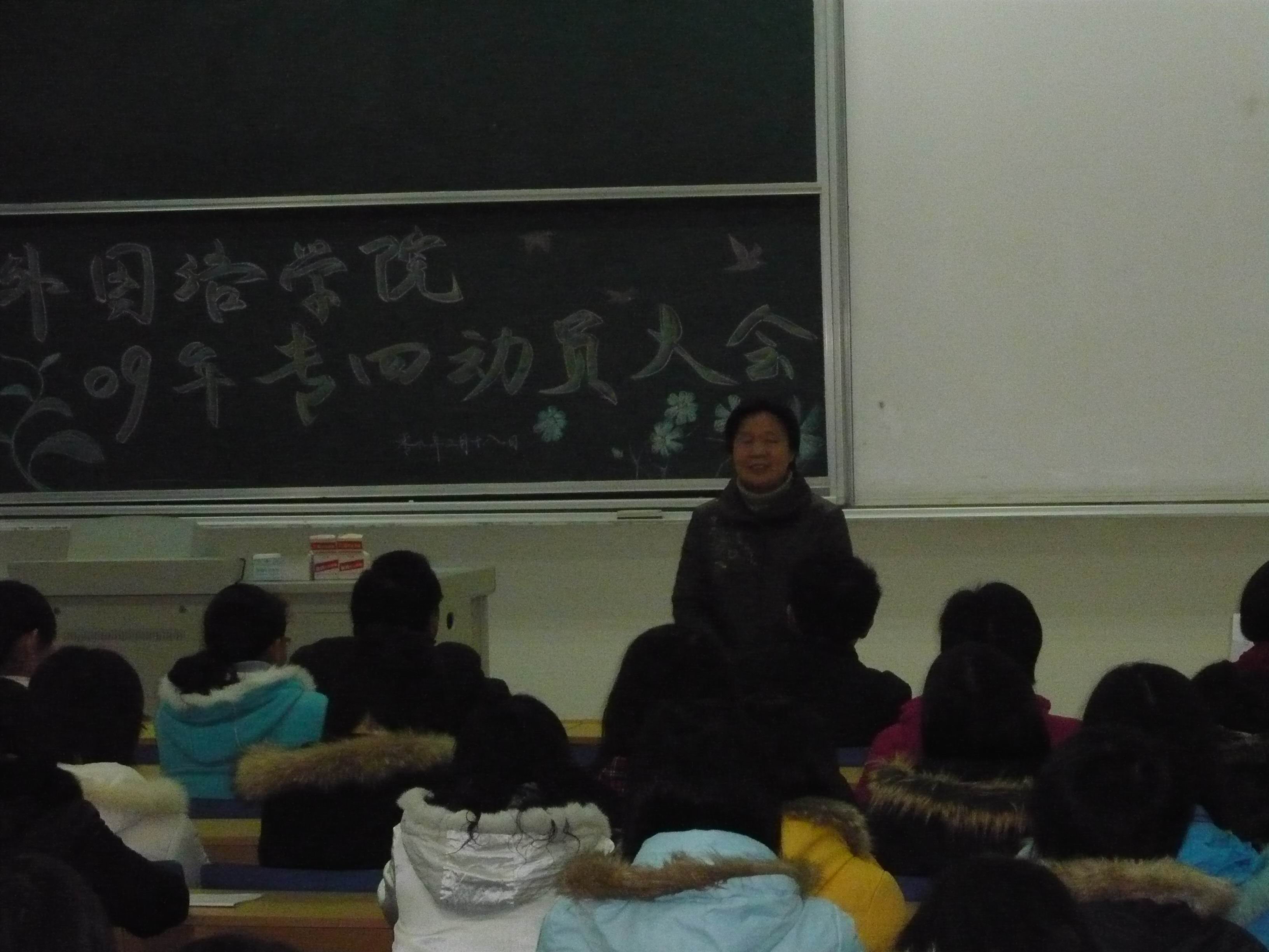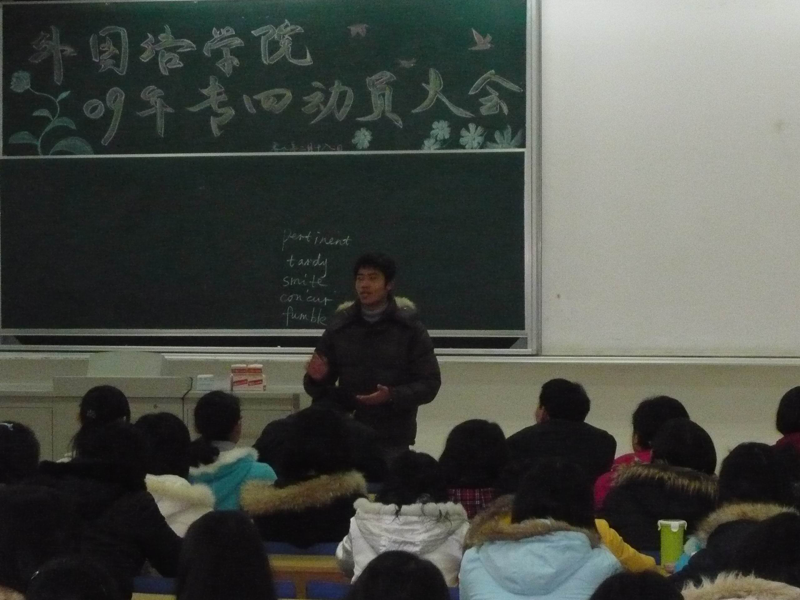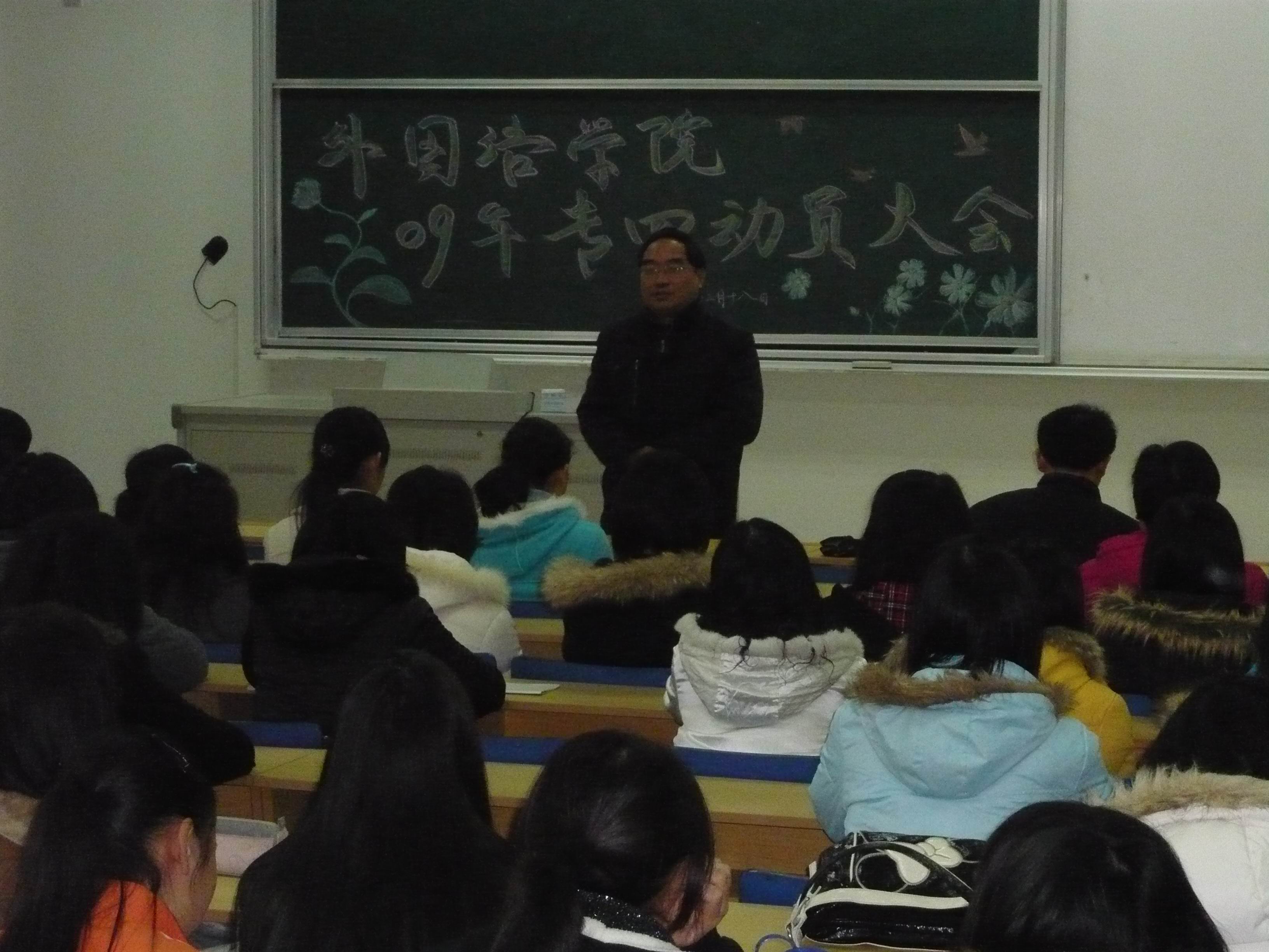 王克明教授着重强调了专四的重要性和必要性。他指出“专四既是对过去学习的总结,又是更高层次学习的基础”,他要求大家抓紧时间好好复习,在专四考试中再创佳绩。孙勇彬副教授指出从今年开始,专四的考试方式及批卷方法都将发生很大的变化,要求同学们在复习的时候也要注意到答题的方式问题。王展副教授主要从时间的安排、答题的方式等方面作了动员。她强调复习要有计划性,每个同学都应该根据自己的情况制定一个自己的复习计划。陈芙蓉副教授则从单词、听力、阅读和写作这四大块对专四考试进行了一番解读,为同学们的备考指明了复习方向。