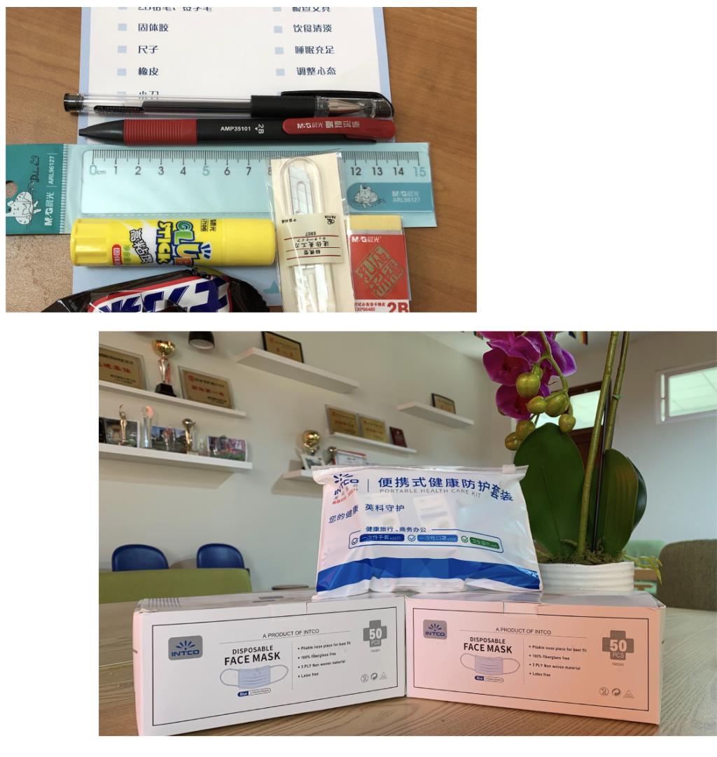 学院为考研同学准备的文具礼包和防疫物资