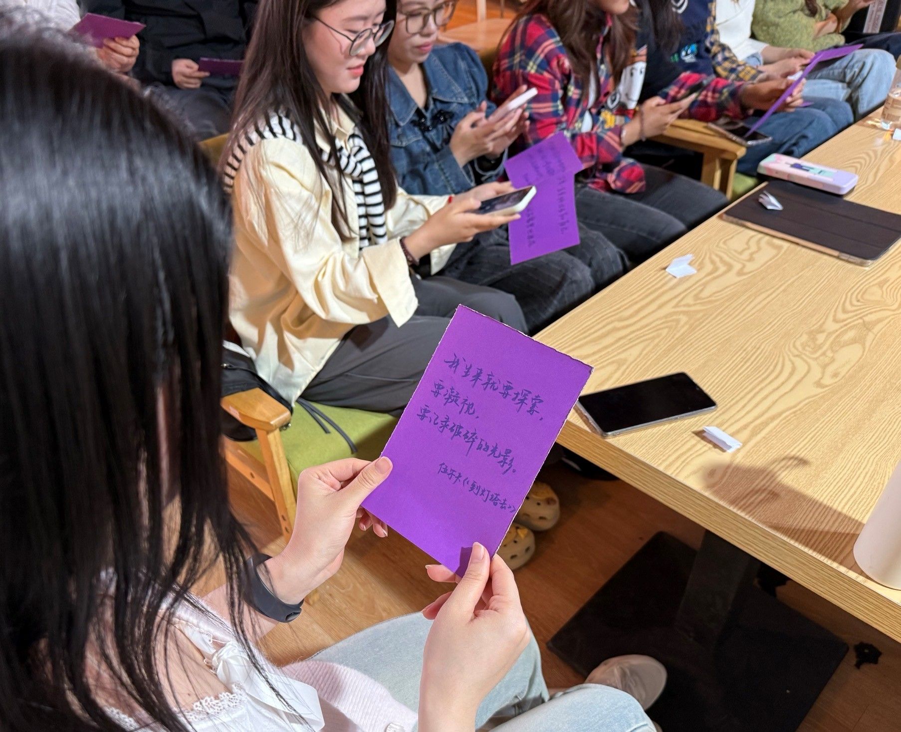 活动通过“情绪词卡挑战”开始,充分调动了大家情绪。同学们随机抽取英日双语情绪词卡,通过表情或动作演绎词汇含义,其他同学则竞相猜测。这一环节不仅考验了同学们的语言表达能力,更让大家直观感受到语言对情绪的传递作用。随后的主题讨论环节中,同学们围绕“语言如何影响心理健康”展开热烈交流。大家结合自身经历,分享了语言对情绪的塑造作用,并探讨了研究生阶段压力与焦虑的来源。