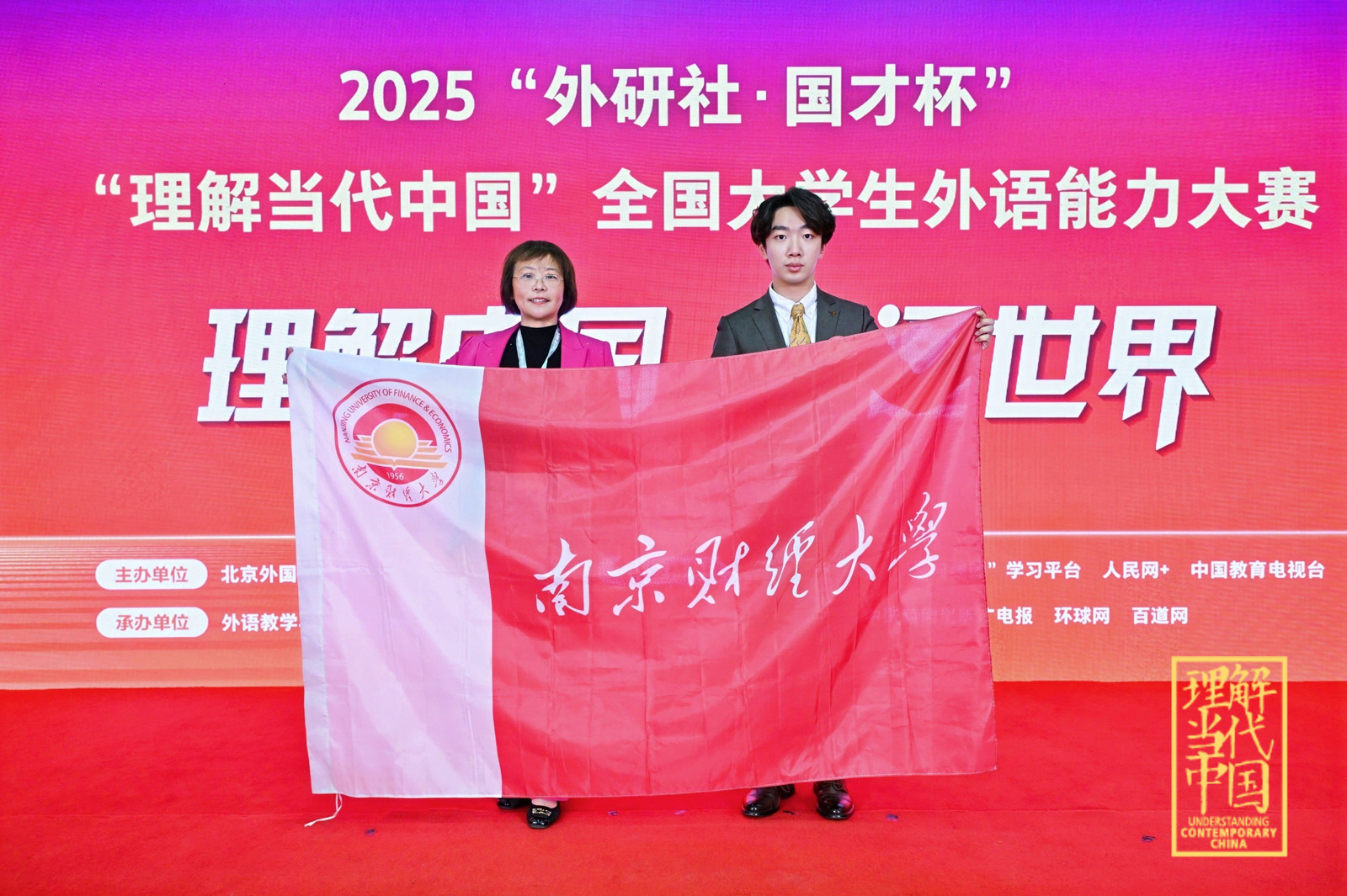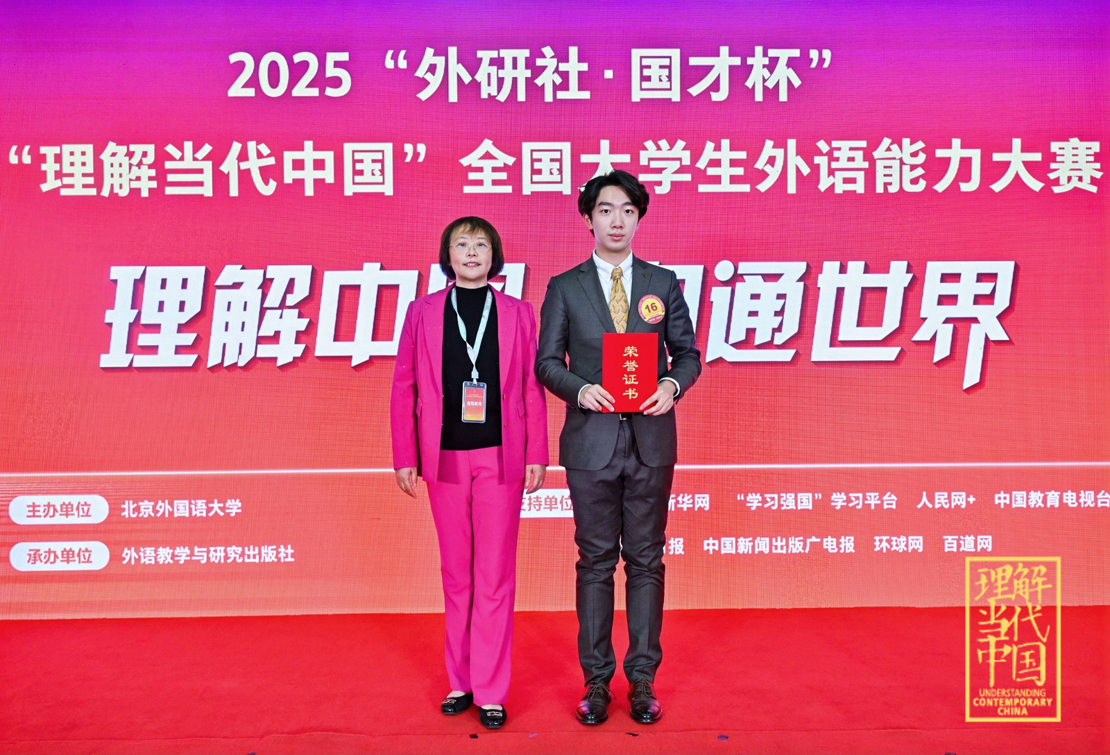 近日,2025“外研社·国才杯”“理解当代中国”全国大学生外语能力大赛英语组口译赛项全国总决赛在北京外国语大学国际会议中心圆满落幕。我校国际经贸学院国贸实验班2401班王从文同学,在william威廉中文陈芙蓉副教授的悉心指导下,凭借过硬的专业实力与出色的临场发挥,从全国众多优秀学子中脱颖而出,勇夺全国总决赛金奖(亚军),总排名位列全国第二,创造了我校在该项顶级全国性外语赛事中的历史最好成绩,为学校赢得了荣誉。