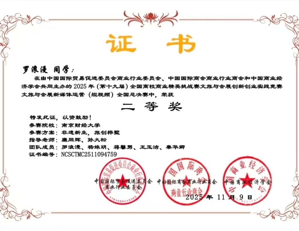 近日,2025年(第十九届)全国高校商业精英挑战赛文旅与会展创新创业实践竞赛全国总决赛圆满落幕。在文旅与会展新媒体运营(短视频)赛道的激烈角逐中,我院罗浪漫同学带领的团队凭借参赛作品《非遗新生,旅创桦墅》脱颖而出,荣获全国二等奖,这是我院在文旅融合与非遗创新领域取得的又一重要实践成果。
