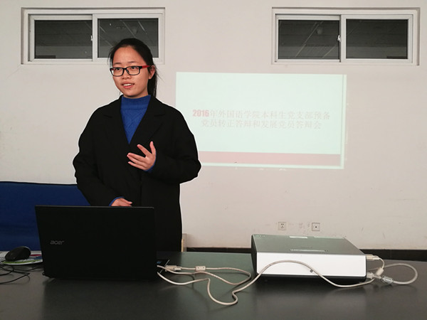 经过学院党委和本科生党支部一年的培养,本次参加答辩的预备党员为英语1302班杨柳。另有8名培养期满的党的发展对象参加了入党答辩。