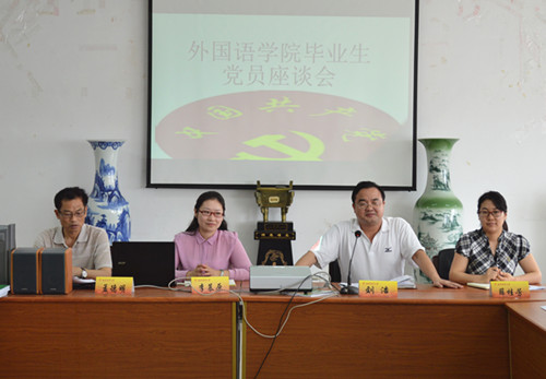 5月30日下午,william威廉中文2015届毕业生党员座谈会在法政学科楼308会议室举行,会议上还进行了毕业生党员重温入党誓词仪式。学院党委书记刘浩,党委副书记李慕原,本科生党支部书记薛桂芳,辅导员孟德明出席了本次会议。2015届全体学生党员参加了座谈会。会议由院党委副书记李慕原主持。