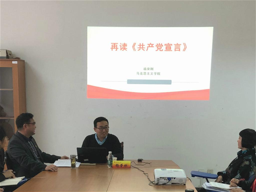 马克思主义学院杨荣刚老师应邀以“再读《共产党宣言》”为题,从《共产党宣言》的当代评价、诞生过程、语言魅力、理论贡献和现实价值五个方面,对这一经典著作做了系统性的解读,深入浅出,让学院教工党员们对马克思主义基本理论有了更清晰的认识和了解。
